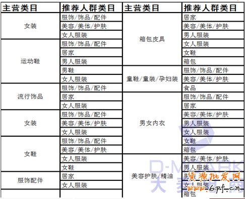 通過大量的數據分析可以得出,主營類目以及推薦人群類目的關系如上圖所示。就拿女裝來說,購買意圖為女裝的消費群體,一般都會購買或者對服飾/飾品/配件、美容/護膚產品。因此,我們可以選擇關聯類目購買人群,進行定向,以獲取更精準流量。