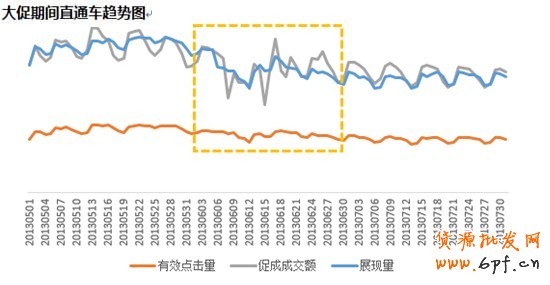 從直通車趨勢圖上可以看出,展現量、點擊量受大促影響不大,但是成交額增量明顯,是投放性價比較高的時間。
