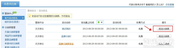供銷后臺(tái)會(huì)出現(xiàn)《營(yíng)銷中心》的菜單項(xiàng)及《官方活動(dòng)報(bào)名》和《組織活動(dòng)(麥麥)》兩個(gè)子菜單,親需進(jìn)入《官方活動(dòng)報(bào)名》,即可看到天天特價(jià)報(bào)名入口。選擇自己想要參加的活動(dòng),點(diǎn)擊按鈕“挑選分銷商”,即可挑選分銷商報(bào)名本次活動(dòng)。