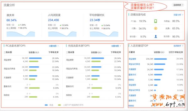 店鋪實時數據、商品實時排行、店鋪行業排名、店鋪經營概況、流量分析(流量構成、PC端與無線端的流量來源、入店關鍵詞)、商品分析、交易分析、服務分析、營銷分析、市場行情,為你展示店鋪經營全鏈路360度無死角的核心數據分析!