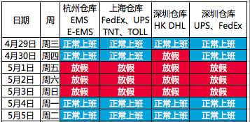 2.受香港DHL假期影響,深圳倉庫HK DHL渠道放假時間為4月30號-5月3號。4月29號為節前最后一天安排出庫,如果遇到港車查驗,將有可能會延遲到5月4號過港交貨。