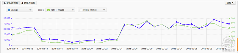 包括整個賬戶的轉化率,店鋪整體DSR動態評分,整個賬戶關鍵詞點擊率。前兩項并非可控因素,只能盡力促進轉化率和優化保持好DSR,而可控的是什么呢?整個賬戶關鍵詞點擊率。我們看下以下數據,30天內賬戶整體點擊率保持穩步上升的趨勢,利用寶貝創意標題、圖片保證優質的點擊率。