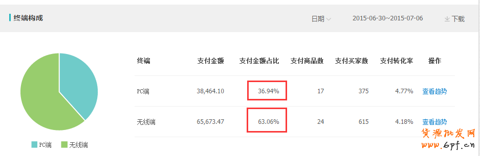 以上是我做的一個店鋪最近一周整個店鋪PC端和無線端點擊成交情況,以上用紅色方框表示的是兩者整店的成交金額占比,PC端占比36.94%,無線端占比卻達到了驚人的63.06%。當然這個占比情況,每個行業(yè),每個店鋪的實際情況對會不一樣,我們需要根據(jù)PC端和無線端流量情況,支付轉(zhuǎn)化率以及兩端的流量成本來進行合理的投放比例設(shè)置,只有這樣才能最大化自己的ROI(投入產(chǎn)出比)。