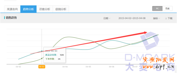 3、查看最近產品訪客轉化趨勢,選定的產訪客和成交趨勢是不斷在往上漲的,也就是說訪客增加,轉化率沒有下降的產品,這樣的產品才會上升的更快。如下圖,訪客和下單件數都不斷增,這樣的產品是很有潛質的。這樣的寶貝權重上升才會更快,排名更加靠前,獲取的免費流量更多。更加利于打造高銷量的款式。