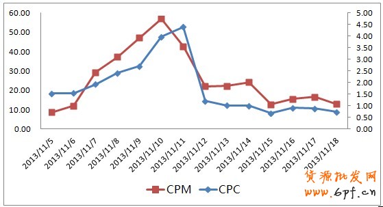 從2013年鉆展數據來看,余熱期的流量恢復到雙11前的水平,但還是維持在比較高的水平,說明雙11的熱度還在延續。cpc降低到10月初的水平,可以用較低的成本拿到流量;從CPM和ROI來說,由于流量競爭下降,競價成本大大降低,另外投產比持續上升,回復到9月底的水平。