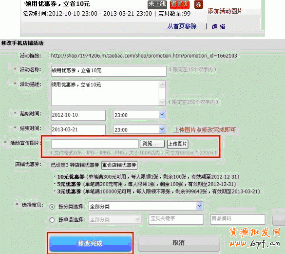 在活動列表,可以找到剛剛創建的,"領用優惠券,立省10元"的活動,選擇右下角的"編輯",回到了,修改手機店鋪活動的頁面,在這里我們可以添加活動圖片,還有更改其它的活動參數等等.