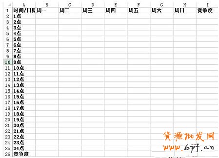 將競爭度填進去之后,就變成了這種格式,之后我們就可以很容易利用這個表格找個哪天的哪個時間段競爭度最低了,之后我們就將競爭度低的時間段利用紅色給標出來,方便查看,如圖: