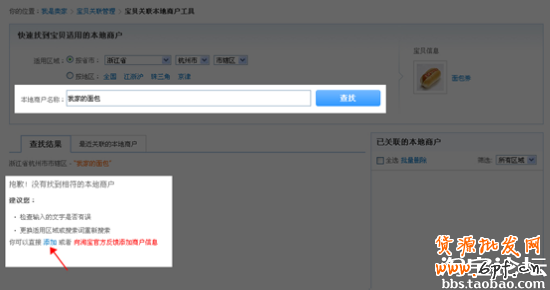 1、當搜索要關聯(lián)的商戶時,結(jié)果為空,則查找結(jié)果有“建議您”的信息,其中有一項為“你可以直接添加或者向淘寶官方反饋添加商戶信息”,請點擊“添加”鏈接。(添加前請多搜幾次確保不是因為店名寫錯,店名、分店名細微不同而導致搜索為空。否則容易導致系統(tǒng)判重而新增不成功,從而關聯(lián)不成功)