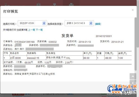 可以點(diǎn)擊訂單后邊的“打印發(fā)貨單”按鈕 ,進(jìn)行單筆訂單的打印和預(yù)覽: