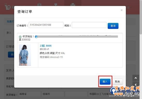 你可以選擇你的任何狀態(tài)的淘寶訂單 進(jìn)行打印,點(diǎn)擊“查詢淘寶訂單”可以通過訂單編號(hào)或者買家昵稱進(jìn)行查詢,選擇你想要打印的訂單,點(diǎn)擊“插入”: