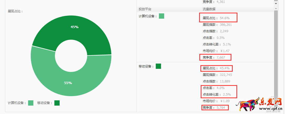 加入這些關鍵詞之后,進入流量解析工具,點擊數據透視查看過去一周的行業數據,查看移動端的競爭指數以及展現占比找出符合的條件的關鍵詞,此外選出來的關鍵詞再移動端的行業點擊率和轉化率就是數據要優化的最低標準,因為直通車是一個競價的原理,如果行業的平均水平都打不到,那質量得分是不可能提升的。