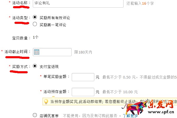 這里需要我們注意的是選擇活動(dòng)類型時(shí),獎(jiǎng)勵(lì)第一筆評(píng)論應(yīng)該不用多說了,這里要說下獎(jiǎng)勵(lì)所有有效評(píng)論是什么意思呢?據(jù)小編經(jīng)驗(yàn),有效評(píng)論是指三十字以上的評(píng)價(jià)、緊扣寶貝屬性內(nèi)容(尺碼、顏色)寫的評(píng)論哦,是淘寶網(wǎng)系統(tǒng)自動(dòng)識(shí)別認(rèn)定的,可以是好評(píng)也可以是差評(píng)。
