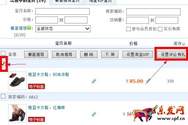 步驟一:打開賣家中心,找到寶貝管理 - 出售中的寶貝,在我們要設(shè)置評(píng)價(jià)有禮活動(dòng)的寶貝前面的方框里打鉤,點(diǎn)擊設(shè)置評(píng)價(jià)有禮,第一次設(shè)置的新手賣家需要開通一下設(shè)置評(píng)價(jià)有禮,再回到出售中的寶貝重新選擇一次哦。