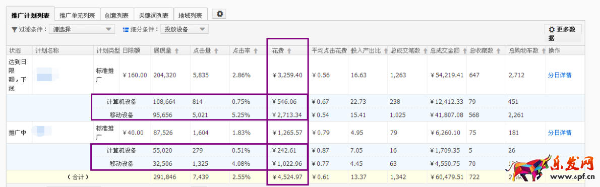 目前車上推廣四款寶貝,是店鋪銷量較好的四款寶貝,日花費限額在200左右,過去30天累計投產13。直通車上無線端流量占到大部分,而且無線端的點擊率明顯高于PC端,有利于提升無線端關鍵詞的質量得分,達到降低平均花費的目的,在消耗相同的情況下,能夠引進更多的流量。