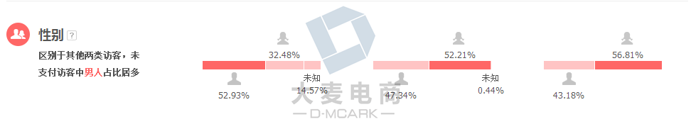 店鋪人群性別其中瀏覽人群以男性為主,但是新買家和老客戶卻以女性為主。過中原因不必深究,但是在直通車的推廣策略上,我們要有所區(qū)別。
