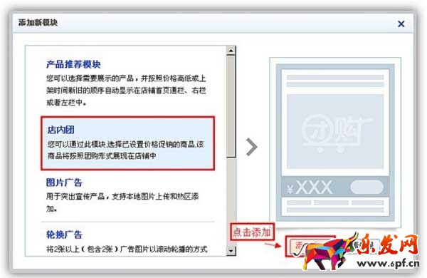 步驟一:選擇店內團,選擇已設置價格促銷的商品,然后點擊添加模塊!