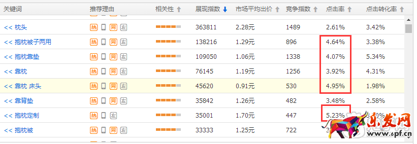 那在選詞的時候就要優先選擇點擊率高的詞,但是也得關注展現指數,有些詞點擊率很高,但是展現很少,這樣也是沒有什么效果的。