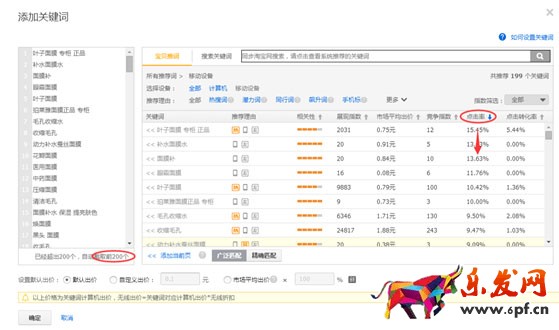 5、添加關鍵詞和老版直通車步驟一樣,此處切記:先做點擊率!管他三七二十一,點擊率排序從高往低。添加一批高點擊率詞進去再說。