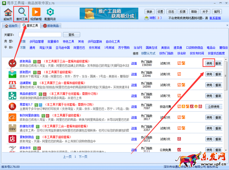 2.運用甩手工具箱:http:///products/pmzq/tg/1656235.html中的抓取商品工具,將需要裂變的寶貝抓取出來然后用淘寶助理進行上傳。獲得自己店鋪中的商品鏈接后再使用商品極速裂變工具。