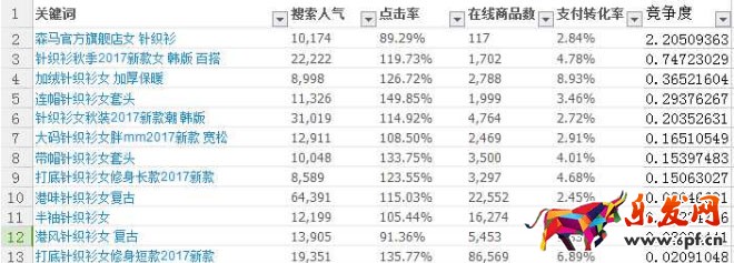 之后就將找到的詞都收集到excel表格里,然后根據這樣一個公式:競爭度=搜索人氣*點擊率*轉化率/在線商品數,去判斷每個關鍵詞的競爭度,然后按降序排列,選擇精準度高的詞使用,可以讓寶貝搜索排名更靠前,轉化更高。