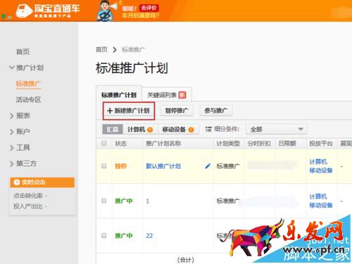 4、進入直通車頁面后,點擊左側(cè)【推廣計劃】選擇【標準推廣】。