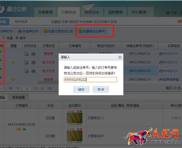 【批量填充運(yùn)單號(hào)】勾選訂單,點(diǎn)擊批量填充運(yùn)單號(hào)按鈕,跳出如下圖填寫框,輸入正確的起始快遞單號(hào),點(diǎn)擊確定可以自動(dòng)按序填寫運(yùn)單號(hào)。