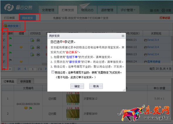 【同步發(fā)貨】同步發(fā)貨頁(yè)面可進(jìn)行同步發(fā)貨操作,預(yù)填好物流公司和運(yùn)單號(hào),勾選訂單,點(diǎn)擊同步發(fā)貨按鈕,可跳出如下提示框,確認(rèn)無(wú)誤后,點(diǎn)擊確認(rèn)就可一鍵發(fā)貨,點(diǎn)擊取消就取消了發(fā)貨操作。