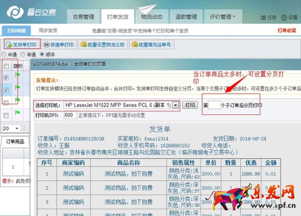 2、當(dāng)單個(gè)訂單中含有的商品數(shù)量太多,一張紙不夠打印時(shí),需要設(shè)置分頁(yè)打印。