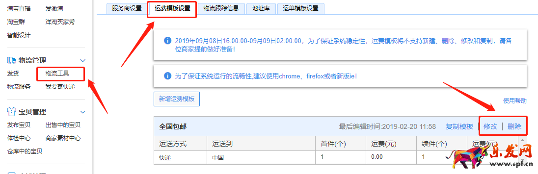 上面的步驟全部完成后,淘寶運費模板就設置好了,如果想要修改或者刪除運費模板,同樣在【物流工具】中點擊【運費模板設置】,然后在對應模板欄中點擊修改/刪除即可。