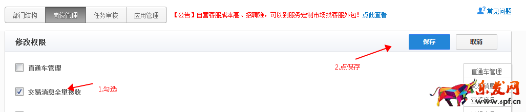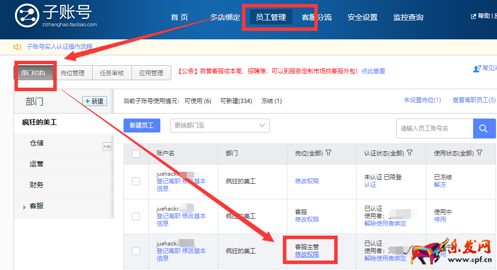 2.主賬號給子賬號開通全量交易消息接收權限,授權方式:請主賬號登錄【賣家中心】-【子賬號管理】-【員工管理】找到子賬號點擊“修改權限”,在千牛權限右側點擊修改權限,勾選“