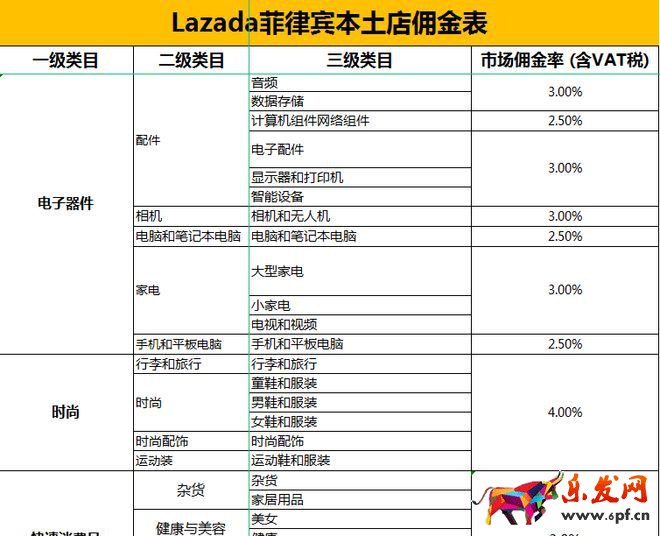 我們可以看到2023年Lazada菲律賓本土店鋪的傭金居然是2.5%-4%,也就是說是有范圍的,具體的類目傭金率是多少呢?是根據不同的類目來收取不同的Lazada傭金費用,我們接著往下看Lazada菲律賓本土店鋪的類目傭金表,如下圖: