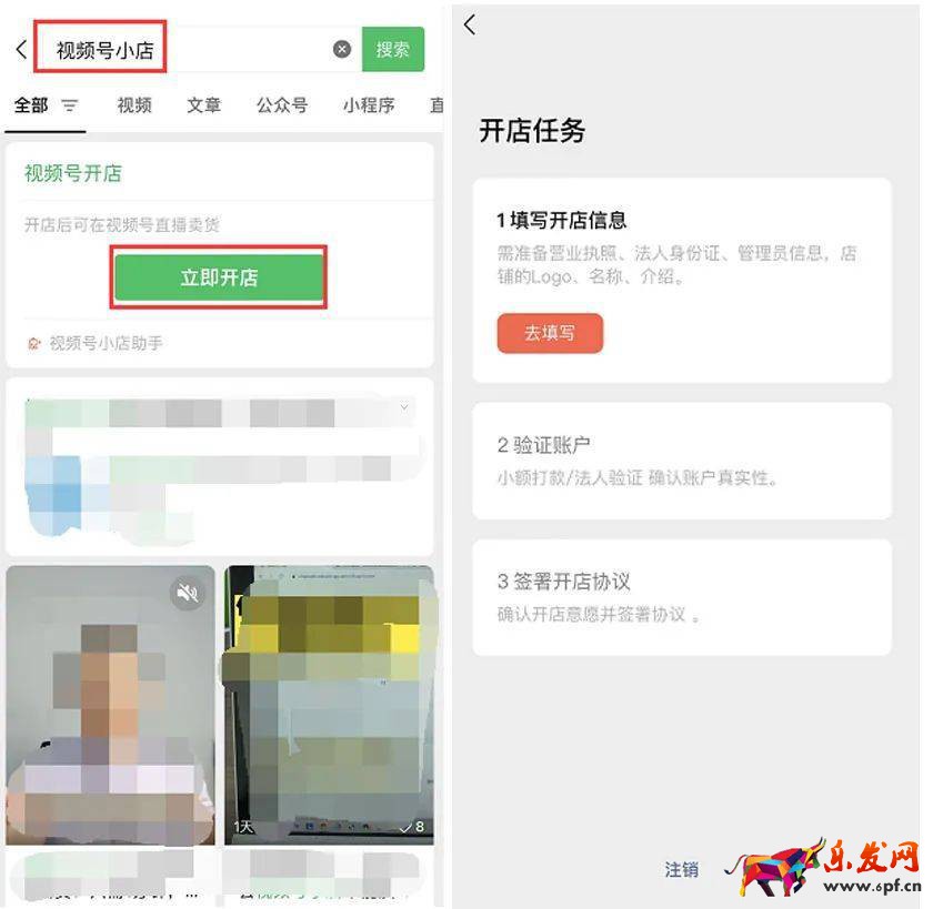 微信手機端搜索“視頻號小店”,可以看見如圖所示“立即開店”字樣,點擊后按照文字提示上傳填寫資料,就可以完成開店。