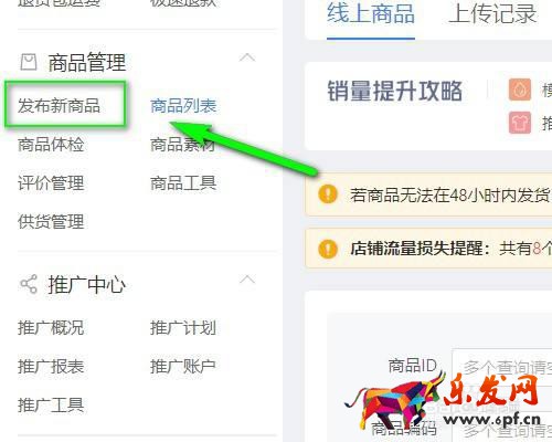 2 第2步,在左邊列表【商品管理】列表下點擊進入【發布新商品】。