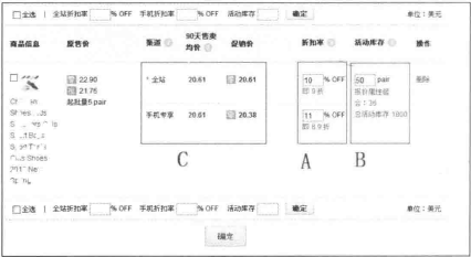 如果填寫全站折扣率后,又繼續對該商品設置手機折扣率,PC端將只出現全站折扣率,無線端將出現你設置的手機折扣率。比如:設置商品A的全站折扣率為75%OFF,設置它的手機折扣率為80%OFF,當促銷開始后,買家通過PC端訪問A商品頁面時,他將看到75%OFF的折扣率,當他通過無線端訪問時,將看到80%OFF的折扣率。